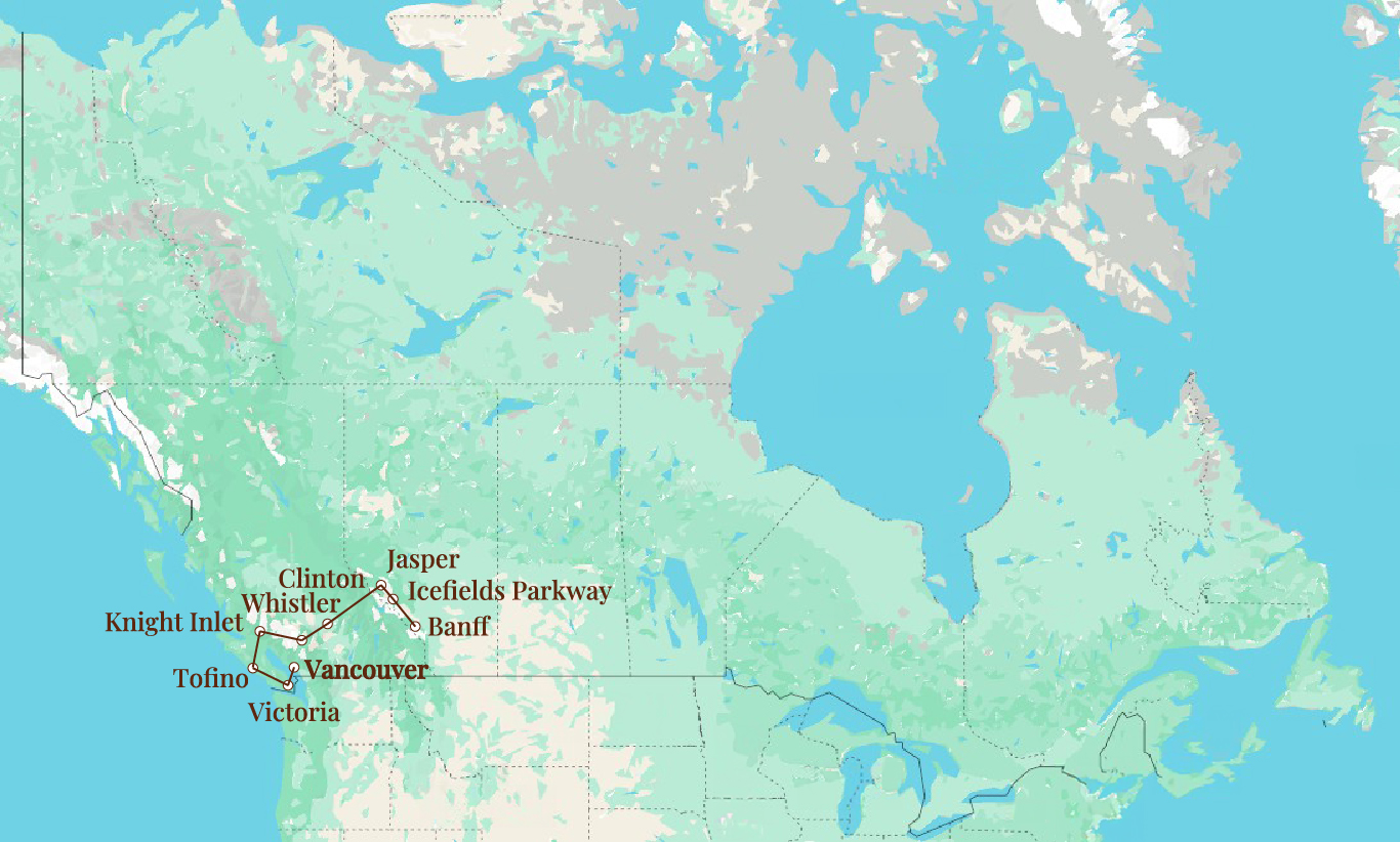 Van de Pacifische kust en de regenwouden rond Vancouver Island tot de iconische Rocky Mountains, waar gletsjers, turquoise meren en alpine landschappen elkaar afwisselen.